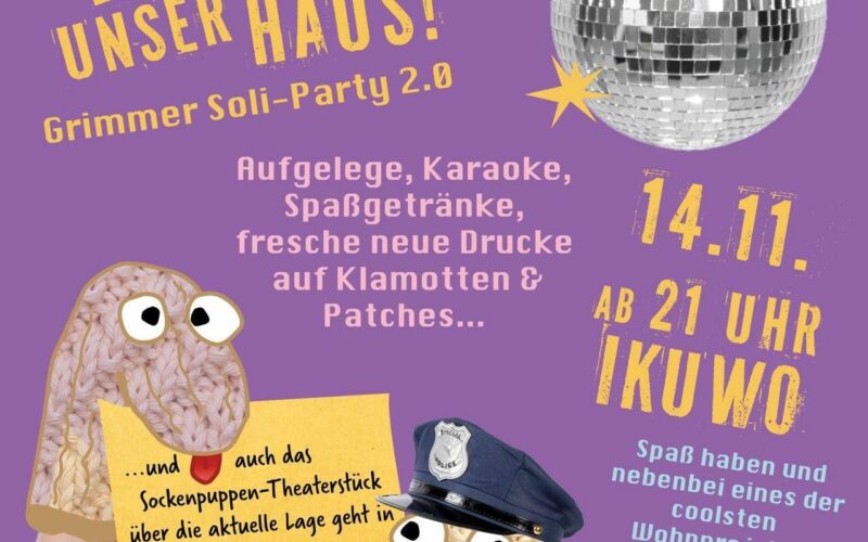 Sad but true: der Kampf um die Grimmer als das alternative, solidarische und feministische Wohnprojekt, was es ist, geht nun schon über ein Jahr! Doch wir geben nicht auf, für die Strukturen zu kämpfen, die wir jahrelang aufgebaut haben und vor allem: wir lassen uns den Spaß nicht nehmen! Darum: kommt zur nächsten Grimmer-Sause am 14.11. ins IKUWO (bei uns geht leider aus gegebenem Anlass gerade nicht) und macht euch mit uns nen spaßigen Abend!
