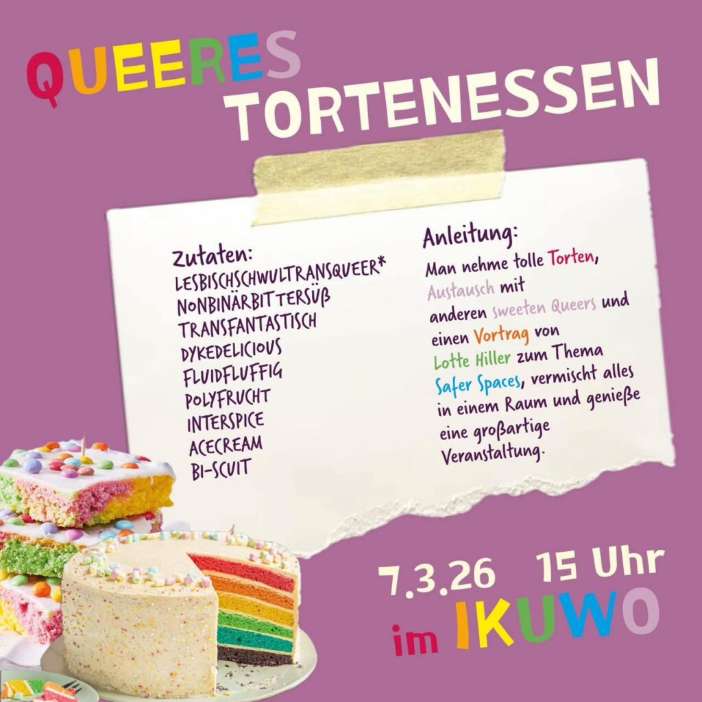 An alle Queers, gays und theys: Wir laden euch herzlich zum ersten Queeren Tortenessen ein. Kommt vorbei zum reden, spielen, lachen, weinen, tanzen und vor allem – Torte essen!
